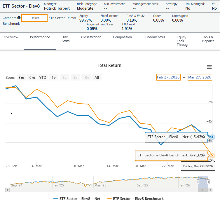 ELEV8 Sector Rotation Model Portfolio: April Positioning vs. Benchmark Simulated S&P 500 (data as of 3/30/2026)