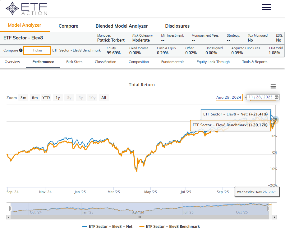 Performance Recap: Elev8 Performance vs. Benchmark (August 29, 2024 – November 28, 2025)