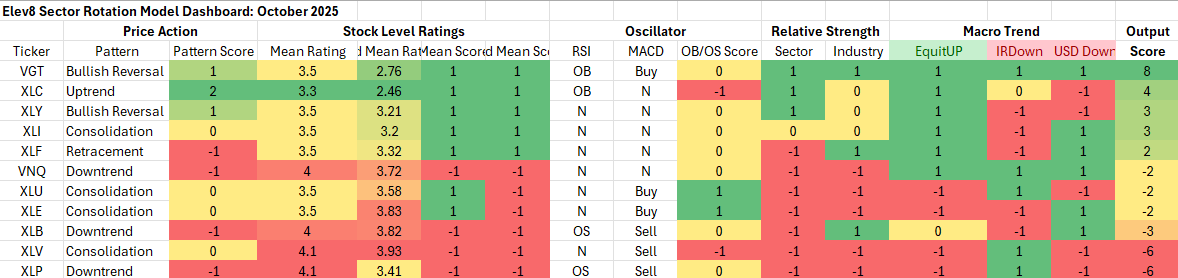 Our model starts October long the Tech and Comm. Services Sector and out of Materials, Staples and Healthcare sectors. A dovish Fed, continued strong demand for AI themes and structural challenges to legacy businesses which dominate Staples, Materials and Healthcare sectors are high level reasons informing our choices along with the technical and macro inputs in our Elve8 model.