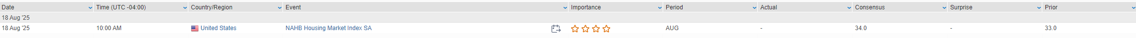 Macro calendar is light with August NAHB sentiment due today. Markets are in wait-and-see mode for Jackson Hole, with Powell’s Friday speech the key event; Fed minutes and comments from Bowman and Waller also due midweek. Street expects ~53 bp of cuts priced in for 2025 but risk of hawkish tone remains.