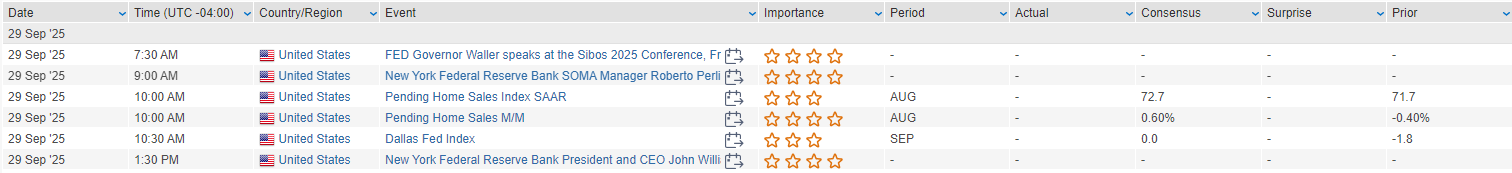 Focus remains on U.S. shutdown risk ahead of Tuesday’s deadline. Trump meets congressional leaders at the White House today after last week’s cancelled session. Markets remain relatively unconcerned about lasting economic damage, though risks include data release disruptions and potential federal job cuts. Broader narratives unchanged: bulls point to Fed rate-cut expectations, favorable Q4 seasonality, and resilient economic data; bears flag political uncertainty and looming labor-market reports.