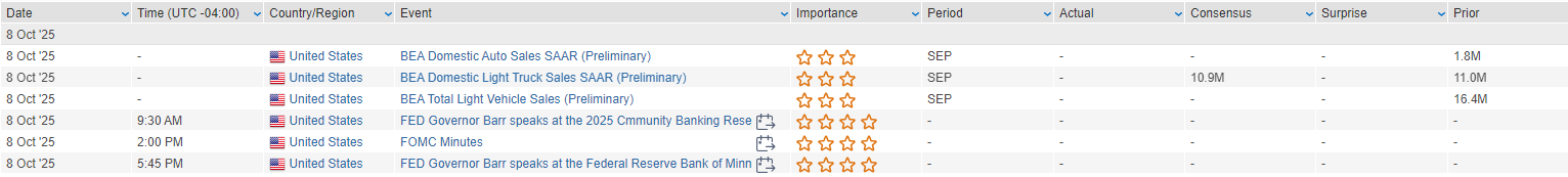 September FOMC minutes are due this afternoon. The Fed’s last meeting delivered a 25 bp rate cut with a dovish-leaning dot plot (two more cuts projected this year), though Powell’s comments signaled a risk-management approach and limited support for larger cuts. Fed speakers today include Musalem, Barr, and Kashkari, alongside the $39B 10-year Treasury auction. Thursday brings Powell (pre-recorded), Bowman, Barr, Kashkari, and Daly, followed by Friday’s University of Michigan sentiment and Fed remarks from Goolsbee and Musalem.