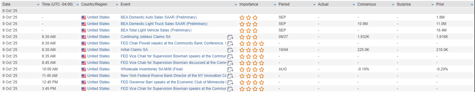 Another full slate of Fed commentary is expected today, including Powell’s prerecorded remarks at a community-banking conference. Overnight, NY Fed’s Williams told the New York Times that further rate cuts may be needed to support the labor market. In Washington, there’s no movement on the shutdown, though Republicans are reportedly exploring department-by-department appropriations bills. Treasury will auction $22 B in 30-year bonds today following a weak 10-year sale Wednesday marked by soft foreign demand. Abroad, France’s Macron said he will appoint a new prime minister by Friday, while Trump claimed both Israel and Hamas have signed initial phases of his Gaza peace plan.
