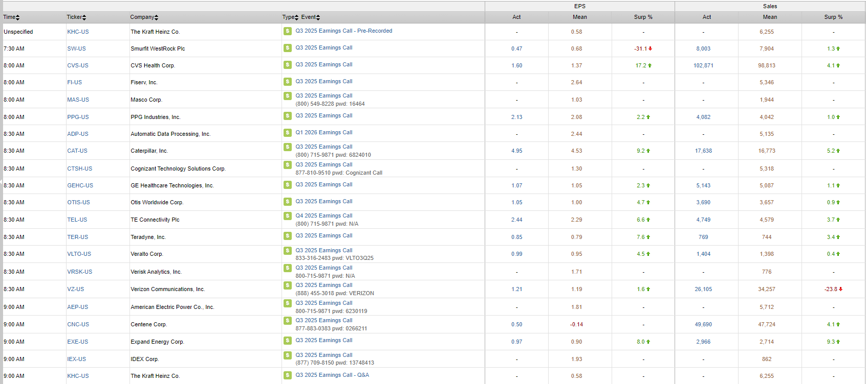 - Corning (GLW) −3.3% – Beat estimates but Optical sales missed; sentiment pressured after 90% YTD rally.