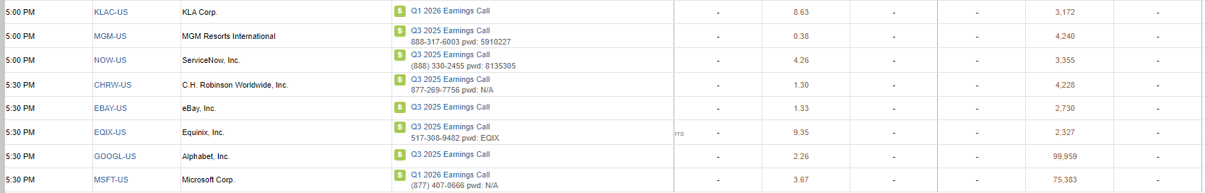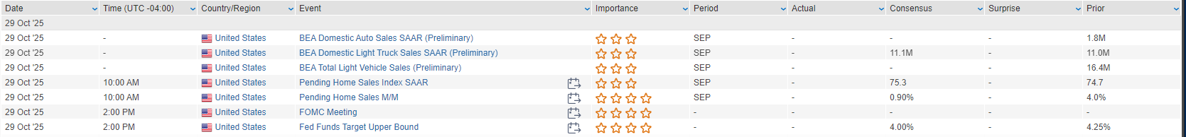 Markets remain in a holding pattern ahead of key catalysts: Wednesday’s FOMC decision (25 bp rate cut to 3.75–4.00% widely expected and possible end to QT), Mag 7 earnings (Wednesday and Thursday post-close), and the Trump–Xi summit on Thursday, where further tariff de-escalation headlines are anticipated.