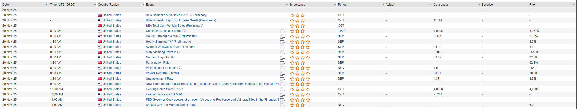 A delayed September jobs report hits this morning (Street: ~+50K), alongside jobless claims, the November Philly Fed survey, and October existing home sales. Fed speakers today include Hammack, Cook, and Goolsbee, with Miran and Paulson tonight.