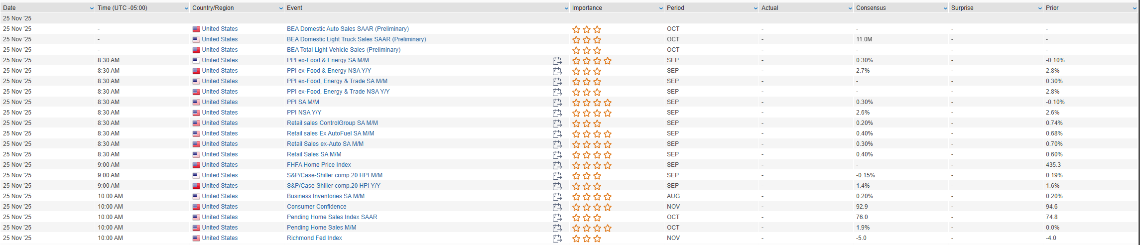 Economic updates were mixed. The Dallas Fed manufacturing survey printed at –10.4, below consensus, with worsening outlook components. Treasury’s $69B 2-year auction priced in line with expectations but drew stronger bid-to-cover and foreign demand. Looking ahead: a heavy data slate Tuesday (September retail sales, PPI, October pending home sales, November consumer confidence) and important labor and durable goods updates Wednesday. Markets are closed Thursday for Thanksgiving; Friday is empty. Fed enters blackout this week; no additional Fed speakers scheduled.