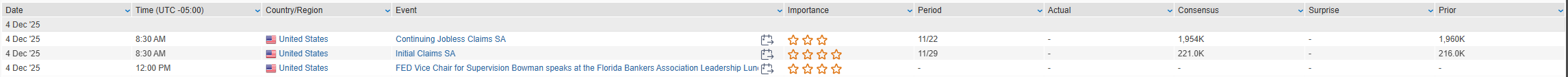 The macro narrative remained relatively unchanged ahead of next week’s Fed and major AI events. Markets continued to digest modest crypto and rate stabilization, AI-related dispersion in equity performance, and an improving holiday-shopping backdrop. Labor-market softening also gained attention after the ADP private-payrolls decline, supporting expectations for a dovish December FOMC meeting. Meanwhile, stronger-than-expected ISM Services and ongoing commentary about Kevin Hassett as the likely Fed-chair pick rounded out the policy backdrop.