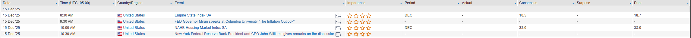 There were no economic data releases, but heavy post-FOMC Fed commentary shaped sentiment. Goolsbee reiterated optimism for meaningful rate cuts in 2026, while Schmid and Hammack emphasized inflation risks remaining closer to 3%. Fed chair succession headlines also lingered, with Trump indicating finalists include Warsh and Hassett and reiterating his desire for consultation on rate decisions. Attention now shifts to a heavy macro week ahead, highlighted by November NFP (Dec 16) and November CPI (Dec 18).