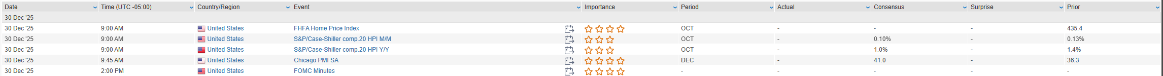 Tuesday’s calendar includes the FHFA and S&P Case-Shiller home price indexes for October, the Chicago PMI for December, and the release of the December FOMC minutes. Initial jobless claims will be released a day early on Wednesday ahead of the New Year’s holiday closure on Thursday. Friday’s final manufacturing PMI is the only data point to close out the week. Early-2026 catalysts remain centered on the Fed chair nomination, a Supreme Court tariff ruling, new LLM launches, and the upcoming government funding deadline.