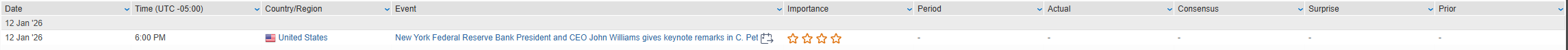Geopolitical risk remains elevated, with growing protests in Iran, Trump comments about potential U.S. options (briefing expected Tuesday), possible new Russia sanctions, and ongoing Greenland-related diplomacy. Despite today’s pullback, pro-cyclical rotation and market broadening remain a dominant early-2026 narrative. The week ahead is heavy with catalysts, including the start of Q4 earnings, December CPI, extensive Fed speak, and a possible SCOTUS ruling on IEEPA tariffs midweek.