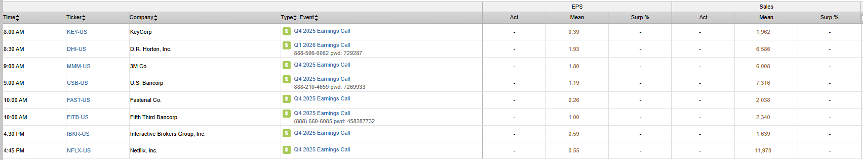 • Earnings today: MMM, DHI, FAST, FITB, KEY, USB; NFLX after the close.