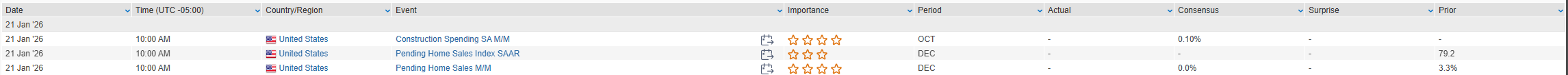 U.S. equity stabilization this morning is being attributed to hopes that President Trump’s meetings in Davos could offer a de-escalation path around recent tensions tied to Greenland, reinforced by a slightly more conciliatory tone on Tuesday about reaching an agreement that would keep NATO “very happy.” Global risk sentiment also found some support from overnight JGB stabilization, after Japan’s finance minister called for calm and speculation grew around potential intervention following recent volatility in Japanese rates. Earnings remain secondary to macro and geopolitics for now, particularly with investors still waiting on Big Tech results and questioning the muted reaction to recent beats, consistent with a high-bar earnings dynamic. On the policy front, today features Trump’s Greenland meetings and affordability speech in Davos, along with a Supreme Court hearing on Fed Governor Cook, while the Fed is in its quiet period ahead of next week’s FOMC. On the data side, construction spending (Sep–Oct) and December pending home sales are due this morning, alongside a $13B auction of 20-year Treasuries, with GDP, PCE, and claims later this week.