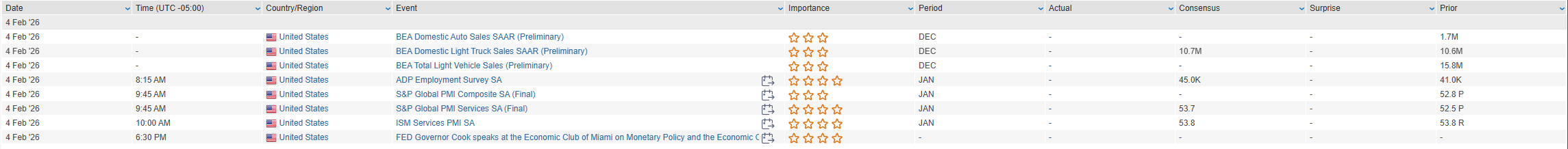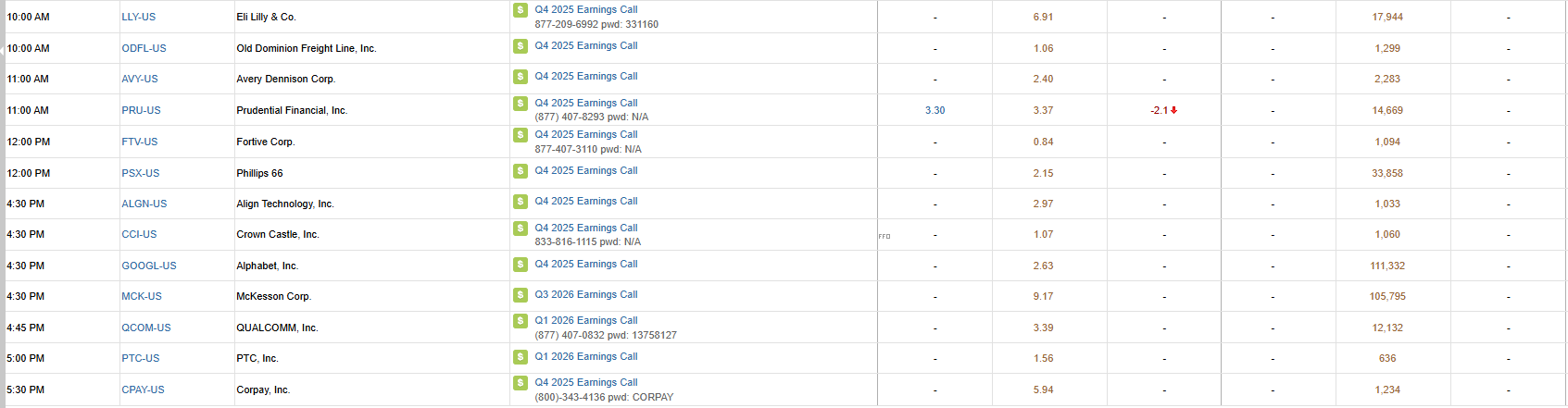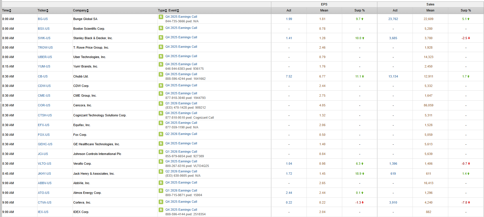 Markets remain relatively quiet ahead of key macro data and the next wave of mega-cap earnings, with Alphabet (GOOGL) reporting after the close today and Amazon (AMZN) tomorrow. The ongoing software selloff tied to AI competition remains a focal point, though broader pro-cyclical rotation and positive macro surprise momentum continue to cushion sentiment.