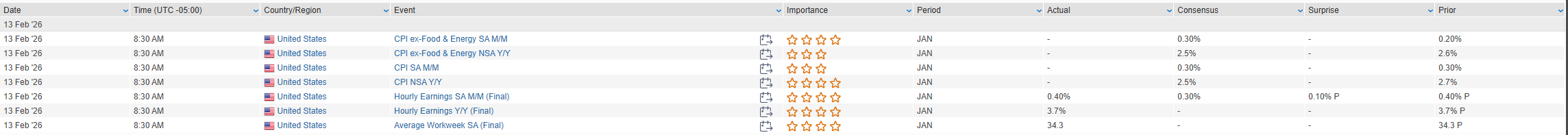 January CPI is due at 8:30 a.m. ET, with headline and core both expected at +0.3% m/m and +2.5% y/y. Looking ahead, next week’s calendar includes Empire manufacturing and housing sentiment Tuesday; housing starts, durable goods, industrial production, and FOMC minutes Wednesday; trade balance, claims, Philly Fed, and pending home sales Thursday; and PCE inflation, flash PMIs, and new home sales Friday.
