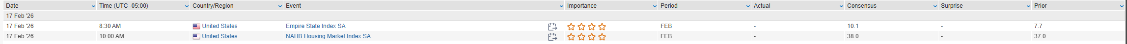 On today’s calendar: February Empire State manufacturing and the NAHB housing index. Fed Governor Barr speaks at 12:45 on AI and labor markets, followed by Daly at 14:30 on AI and the economy. The rest of the week includes durable goods, housing starts, industrial production, FOMC minutes (Wednesday), initial claims and trade data (Thursday), and Q4 GDP, PCE inflation, flash PMIs, and University of Michigan sentiment (Friday). Multiple Fed speakers are scheduled throughout the week, and SCOTUS could release an IEEPA tariff ruling.