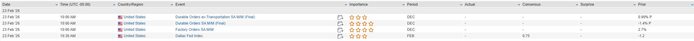 Today’s calendar includes Factory Orders, Dallas Fed manufacturing, and remarks from Fed Governor Waller. The week also features consumer confidence, house price data, PPI, construction spending, and multiple Fed speakers. President Trump delivers the State of the Union Tuesday evening.