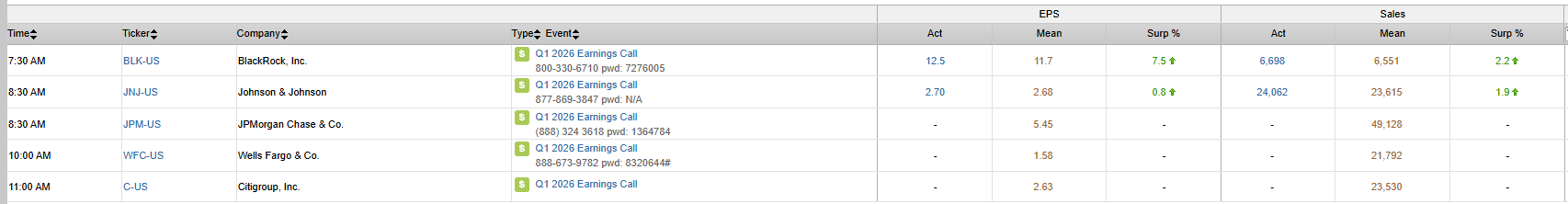 - JPM / C / WFC / BLK (earnings): Reporting this morning; key early read on earnings season