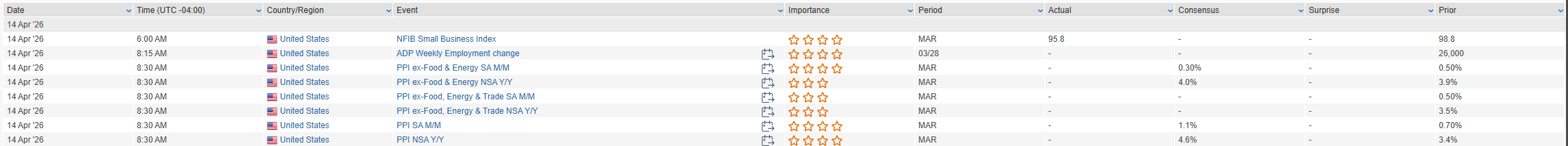 Focus now shifts to inflation and earnings catalysts. March PPI is due this morning (headline +1.1% m/m expected), followed by a heavy slate of Fed speakers and the Beige Book later this week. At the same time, earnings season ramps with several major financials reporting today, reinforcing the market’s pivot toward fundamentals as the next directional driver.