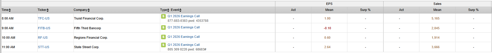 - FITB / RF / STT / TFC: Reporting this morning; focus on regional bank trends and credit conditions