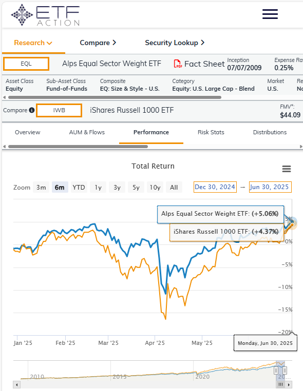 EQL ALPS equal sector weight ETF maintains equal weighted positions of each of the eleven GICS sectors on a quarterly basis. Relative to the S&P 500, this means the fund carries a structural OW vs. the S&P 500 in the smallest sectors by Mkt. Cap., Materials, Real Estate, Utilities, Energy and Staples. This imbues EQL with a counter-trend performance dynamic. See the EQL vs. the iShares Russell 1000 ETF (IWB) YTD performance (below). Where Elev8 gave benefit of the doubt to the prevailing bull trend entering February 2025, EQL entered the month with its structural underweight to the Mega-Cap. Growth trade and the AI trade due to its 20+% underweight in Info Tech. Sector shares. The result was EQL was able to outperform from February through the early April lows Where elevate struggled with its inputs during that period. EQL also offers steady passive exposure, so in theory it is cheaper to trade into one fund than to buy and sell several sector ETF positions to replicate its exposure.