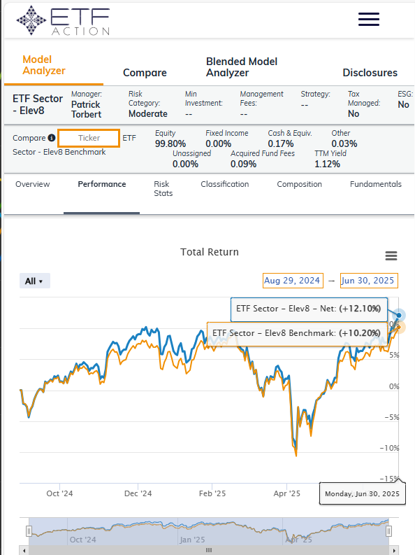 We’ve run the elevate strategy for 10 months now. Results have generally been positive (chart below), but we’ve noticed that the strategy has trouble when top line market conditions change quickly as they did in August 2024 and February of 2025 when sectors went into rotation quickly. When we look at the elevate model’s performance from the end of August 2024 through the end of June 2025, we can see that the model outperformed when equity is moving higher over multi month timeframes.