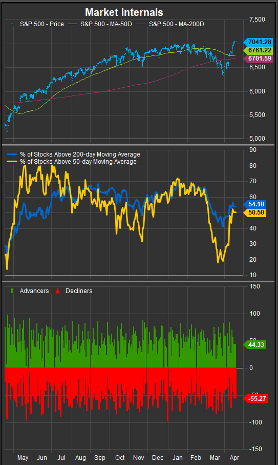 Participation in the rally has remained narrow relative to April/May of 2025. Only 50% of stocks are with the index above their respective 200-day moving averages.