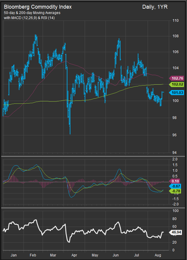 Our macro signals have generally had us looking for signs of inflation as a signal to change our exposure mix. As we can see from the US 10yr Yield chart below, rates are backing up modestly in August but remain well below April/May highs. Inflation and recession, broadly, are the two big macro reasons not to own Growth stocks currently. Historically, the other reason has been robust earnings and economic growth across a wide swath of operating co.’s. That hasn’t been the dynamic in this cycle. Commodities are ticking higher from oversold levels and aren’t telegraphing inflation at present.
