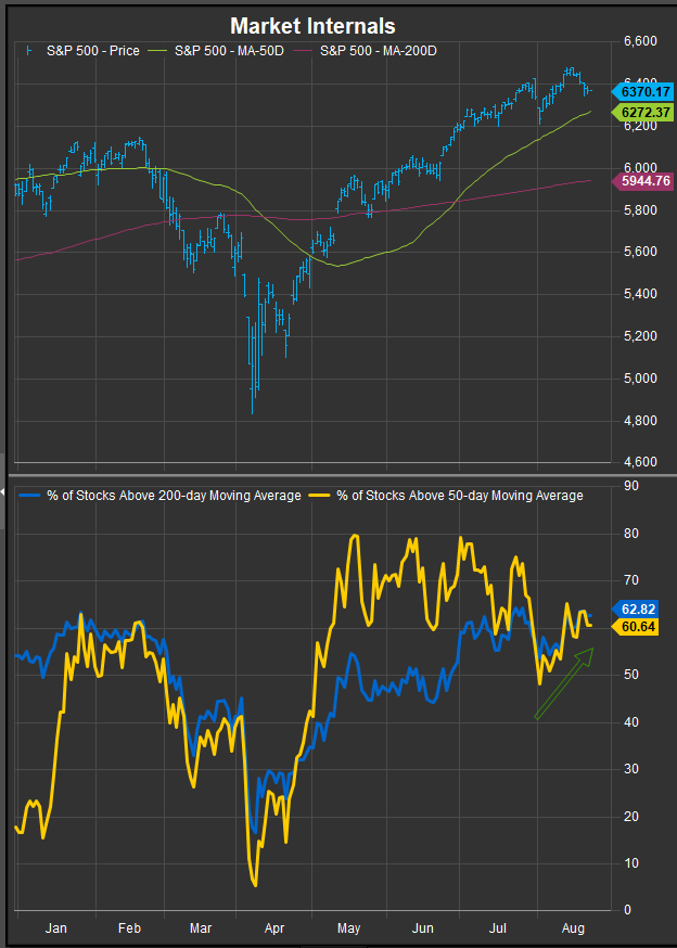 So far, we think the price action looks constructive as a bid away from Tech improves market breadth (chart below). Ideally, we want to see that shorter term series (bottom panel) move above the 80% level.