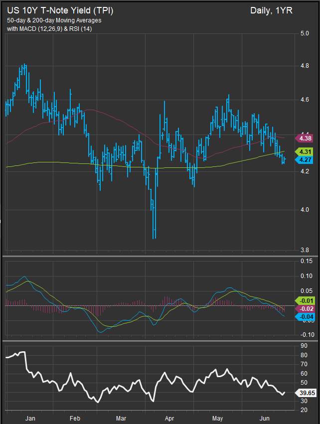 Equities are a few bps shy of all-time highs as June comes to a close. Inputs to our models are supportive of a continued bull trend for equities at present. Oil prices collapsed last week, and the Energy Sector coughed up month-to-date gains. This has taken pressure off of interest rates (chart below) which remain a key pivot for equities.