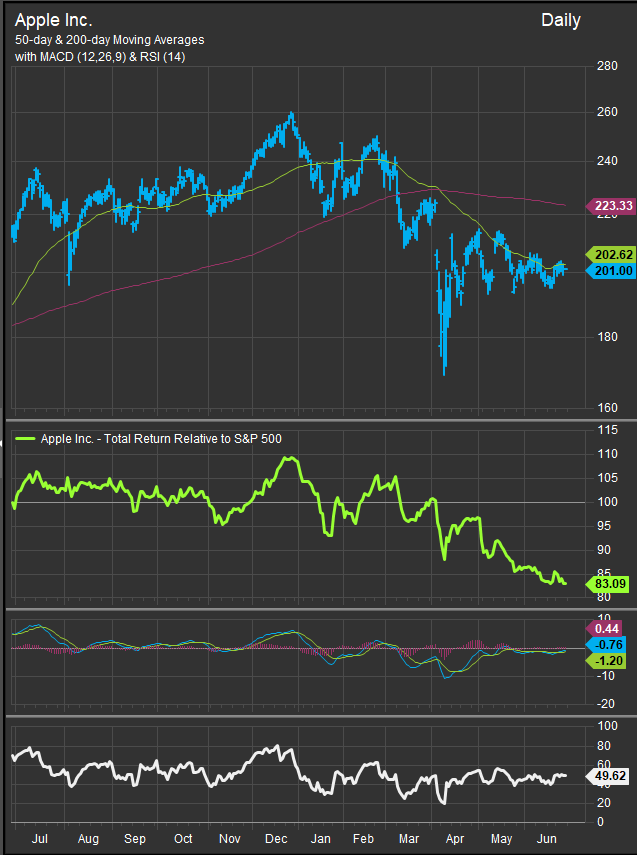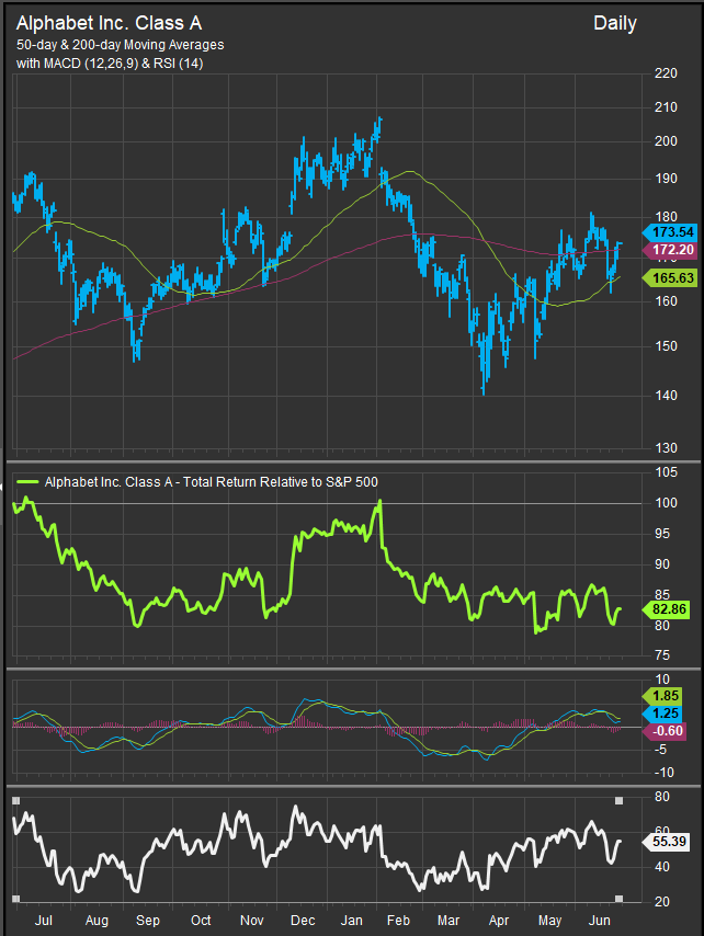We’ve noted some weakness out of Mag7 constituents Alphabet and Apple Corp (charts below). We think this is likely to open the door for other stock level themes to come to the fore. Typically in an extended bull trend there is rotation among growth themes. Mag7 stocks have been seen to dominate the present, but they are not native AI companies. Eventually AI technology will push past these core businesses if past cycles are any hint, the way the internet nurtured and then de-emphasized the capabilities of a premium personal computer. We’re already seeing concerns emerge for Alphabet, in that AI is a threat to their search business.