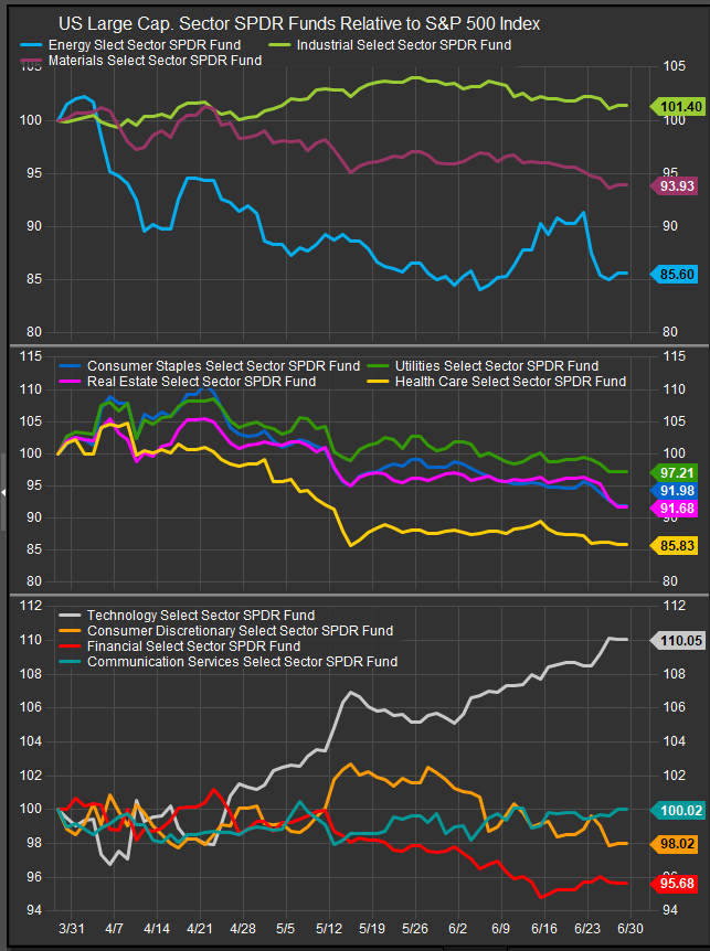 Sector performance since the beginning of April (chart below) has favored Technology stocks at the expense of almost everything else. Comm. Services and Industrial sectors are the only other outperformers over the trailing 3-month period.