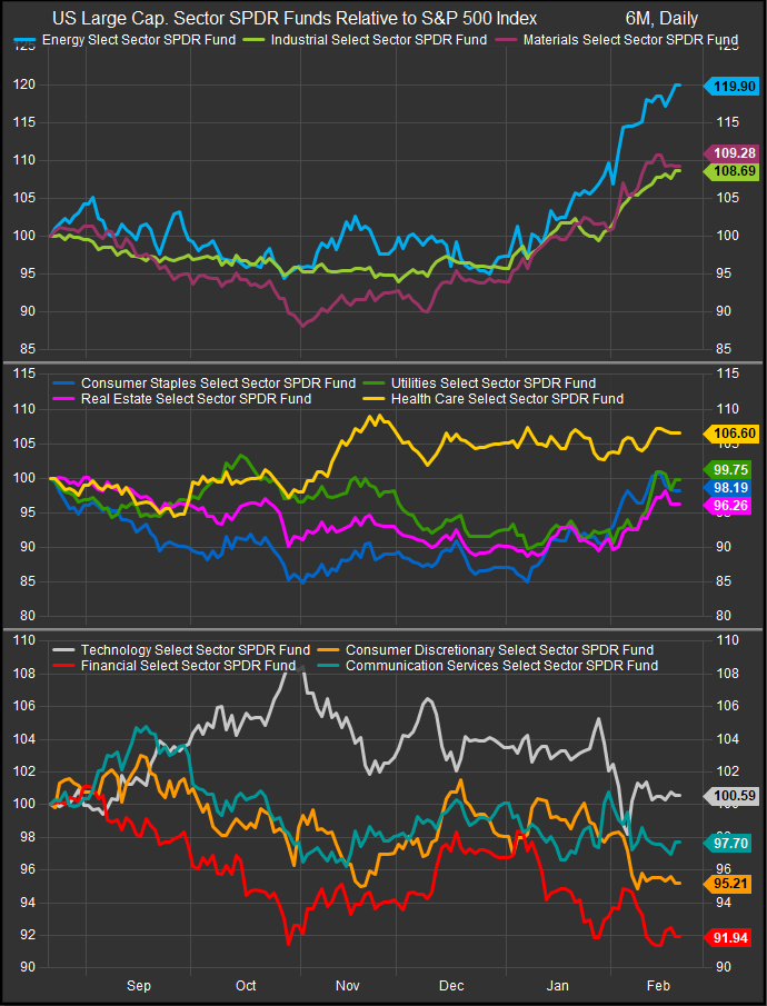 - Energy and Materials benefit from commodity stability and geopolitical uncertainty.