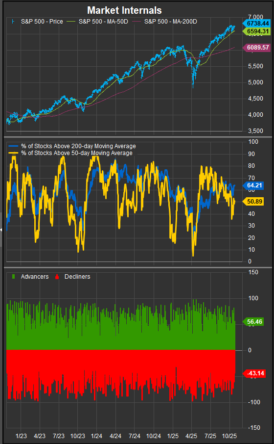 However, without more actual selling pressure in evidence on the top line, it’s hard to diagnose this as anything but a consolidation in the long-term uptrend. The S&P 500 has had several corrections since 2023. Only one, March-April of 2025, approached a bear market threshold in price terms, but October-November 2023 was also a market clearing event with a complete washout in market breadth measures for the S&P 500 (long-term breadth chart below).