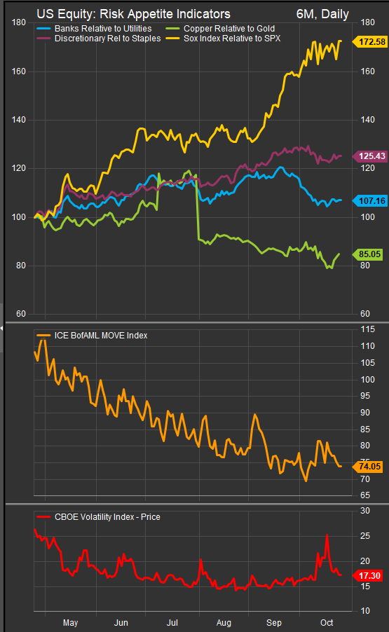 AI has been a difficult concept to gage since its potential applications are almost universal across industries and the promises of its capabilities are theoretically almost limitless. This makes it something that’s potentially worth everyone’s time. So, when we see our risk appetite gages crack like they have recently (chart below) and we get rumors of circular funding and self-dealing juicing AI fundamentals, investors must balance that skepticism against the broadness of the paradigm shift AI technology represents.