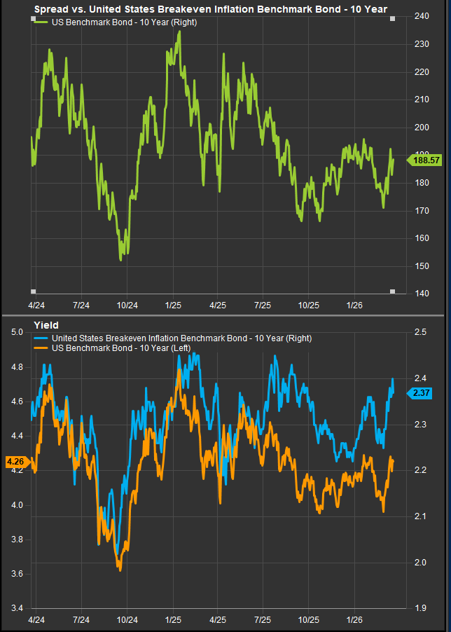 This is why the recent move in rates matters so much. Treasury yields have been drifting higher alongside oil, while market pricing for Fed easing has been pushed further out. The March FOMC reinforced this dynamic, with policymakers signaling a “wait and see” approach and acknowledging the uncertainty created by the Middle East conflict. At the same time, inflation data is beginning to firm again. Core PPI surprised to the upside, running at a 7.8% three-month annualized pace, while energy prices have turned from a disinflationary force into a renewed source of pressure.