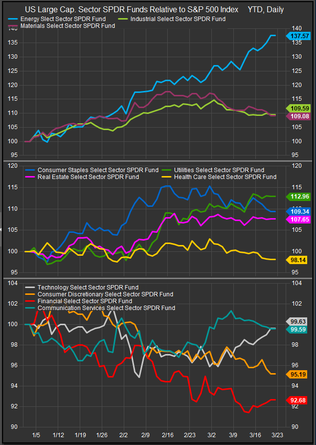 If this trend continues, it creates a macro backdrop that favors Value—at least tactically. Sustained upward pressure on oil, particularly if crude begins to approach the $120–$150 range, would feed through into transportation costs, goods prices, and inflation expectations. That would likely push yields higher across the curve and reduce the probability of near-term Fed easing. In that environment, Energy and Financials would benefit from stronger earnings visibility, while Growth would face valuation headwinds from rising discount rates.