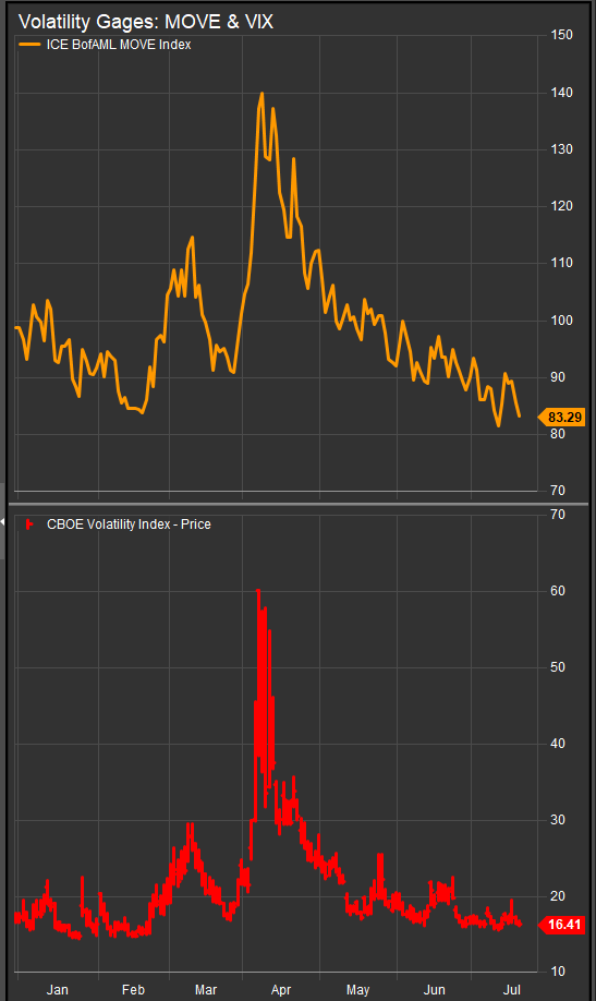 As July ticks on with equities sitting near all-timer highs, there’s a temptation to worry. The volatility of March and April has subsided with the VIX and MOVE indices for equity and bond volatility retracing to pre-decline levels (chart below). The sharp rotation into min vol. stocks, bonds and ex-US equities has subsided.
