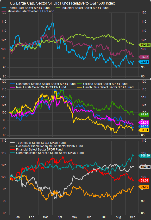 While falling interest rates (chart below) have eased some of the pressure on rate-sensitive sectors, Real Estate, Utilities, and housing-linked Consumer Discretionary still look vulnerable. Mortgage rates remain elevated relative to Treasuries, limiting affordability gains, and August housing data along with Lennar’s guidance suggest demand softness persists despite lower funding costs. Utilities, traditionally beneficiaries of declining rates, are struggling with competition from higher-growth sectors and questions around capital spending efficiency, leaving them less able to capture investor flows. In Consumer Discretionary, homebuilders and housing-adjacent names may not see meaningful relief until lower rates translate into improved affordability and demand, which typically lags by several quarters.
