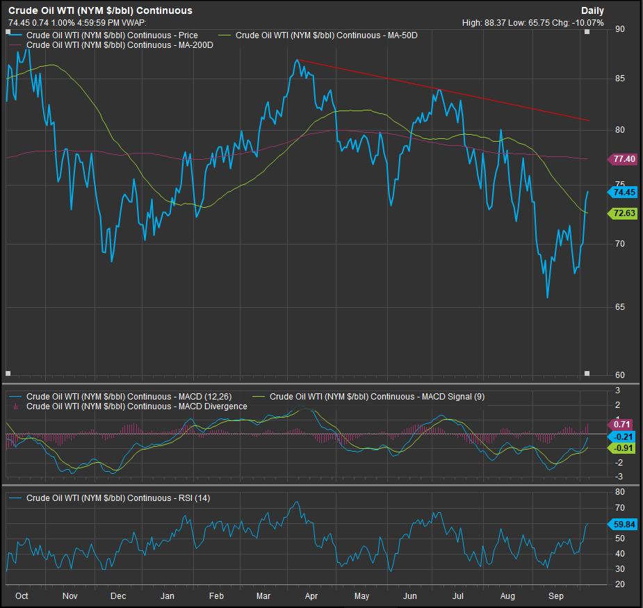 The Elev8 model has us allocating our largest active exposures to Growth aligned sectors at present. We consider the multi-month consolidation in Technology Sector shares to be an accumulation opportunity within the context of a longer-term bull trend. We set expectations based on a rigorous evaluation of price and yield trends across the financial markets to hone our edge. We saw an example of this in action as the S&P 500 reconfirmed its bull market with new all-time highs in September and bullish payroll reports hit the tape at the end of last week. We don’t have an edge on the latter beyond trading with the message from the former. Within the contours of that process, we continue to be aligned with historic beneficiaries of upwards trending equity markets, Technology, Financials, Discretionary and Comm. Services. We have flipped our largest short exposure to min vol. and defensive sectors from Commodities adjacent sectors. Crude prices and interest rates remain pivotal factors to watch this week.
