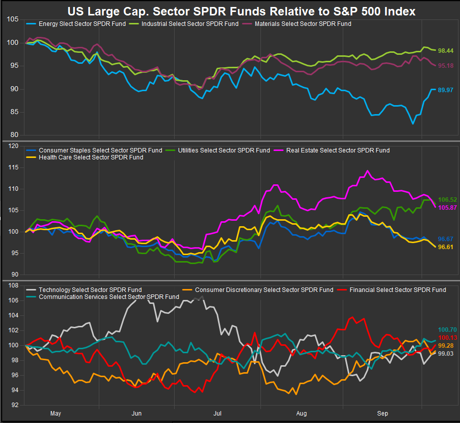 We want to continue to focus on the macro picture and its implications for sector selection and positioning in this week’s letter. In last week’s letter, we talked about the potential for rates and commodities prices to bounce higher with the Fed delivering a 50bp cut to its policy rate. A week later we have seen that price action manifest. From the lens of our GICS Sectors, this has played out over the past 3-months primarily as a push pull dynamic between historically lower volatility, income generating sectors Staples, Utilities. Real Estate and Healthcare and commodities adjacent sectors like Industrials, Materials and Energy. Perhaps not surprisingly, the sectors that animated much of the longer-term bull trend, Technology and Comm. Services have been in consolidation over this period with the former retracing gains from earlier in the cycle and the latter pushing sideways.