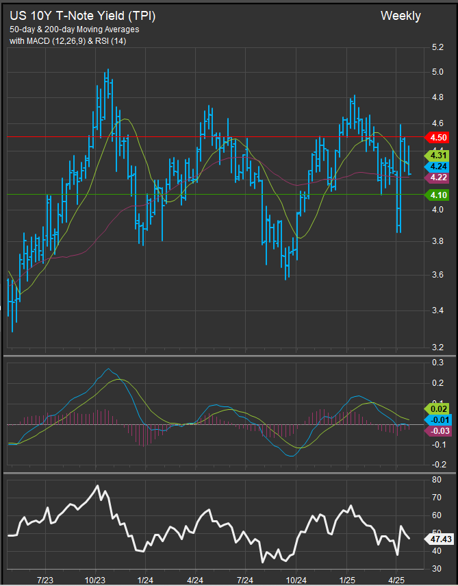 We think the 10yr Yield chart will re-emerge as an important indicator. Looking back over the past 2 years of action, we see the range between 4.1 and 4.5% as the congestion zone while above that level the chart reflects inflationary concerns and below that level we’ve seen the S&P 500 bounce. We think the direction of rates will determine whether the economic cycle can continue to expand.