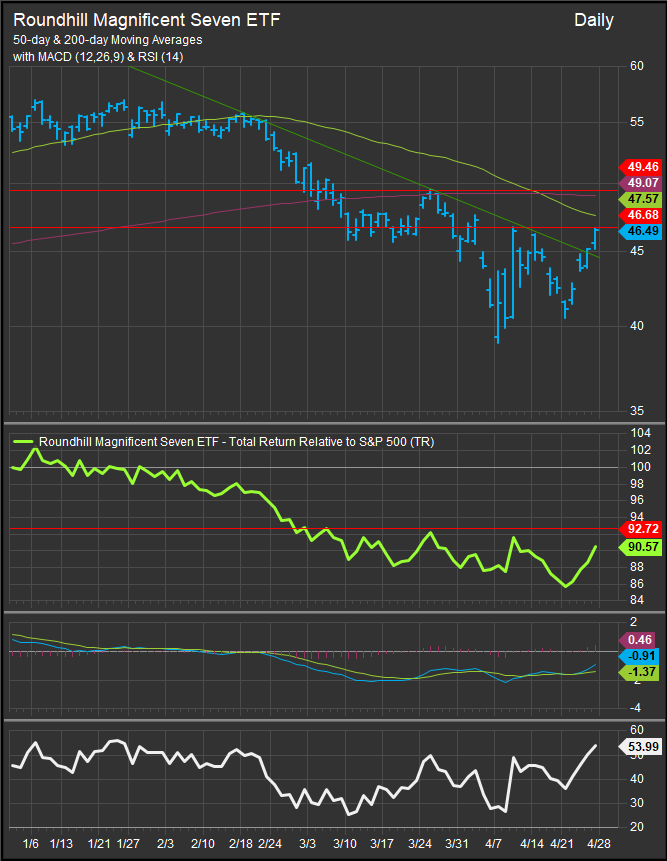 The Mag7 cohort of Mega Cap. Growth stocks is a big driver of the sector dynamics we are evaluating. The Roundhill Magnificent Seven ETF (MAGS, chart below) is attempting to form a bullish reversal of its own, but Mega Cap.’s haven’t been the tip of the spear on this bullish reversal. It’s been a move into the average Growth stock, rather than the biggest names that has lifted higher beta sectors in the near-term. Regardless, we would expect Mag7 to reflate with the broader Growth trade absent new exogenous downside catalysts.
