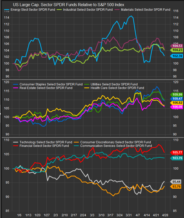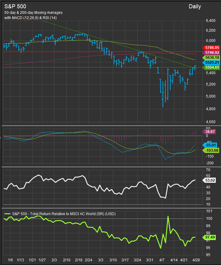 S&P 500 price has moved above the 5504 level which is our minimum threshold for bullish reversal price action. Confirmation would come with a move above 5786. Based on our interpretation of the chart, that level is the neckline of a potential top for the index. It is also above the 50 and 200-day moving average levels which are typically where swing traders put their sell orders in. Point being, above that level, the buyer demonstrates control of the tape. Oscillator work is showing a tactical buy signal on the MACD study while the S&P 500 price relative to the MSCI All-Country World Index has begun to tick higher again after a sharp initial bounce on April 9.