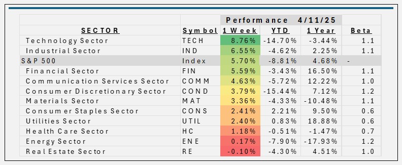 - Industrials (+6.6%) were also helped by the tariff pauses, and some firms tied to defense and domestic manufacturing rallied further, driven by an executive order. Huntington Ingalls Industries gained the most up 7.4% for the period. Fastenal picked up 6.4% and was he second best performer.