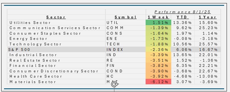 - Just when you thought all the S&P Sectors were close to a positive YTD return, this week ruined that. Performance of the S&P500 for the week ending August 1, 2025, fell by 2.4%. Driven by heightened trade tensions due to newly announced tariffs, weaker-than-expected employment data signaling an economic slowdown, shifting expectations for Federal Reserve policy, and sharp declines across key stock sectors, all contributing to a spike in volatility and risk-off sentiment among investors.