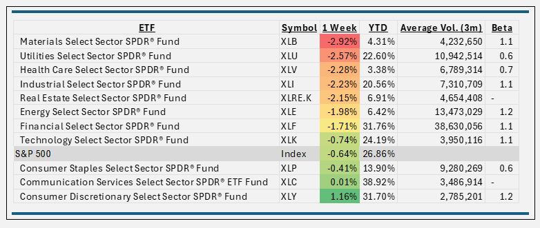- Utilities fell 2.6% for the period. Vistra Corp. (-9.4%) and Constellation Energy (-5.7%) collectively are about 11% of the index contributed to the struggle this week.
