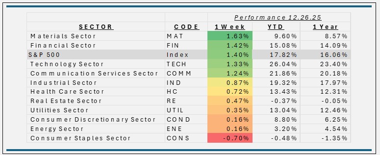 - Financials also posted solid gains, rising 1.4% as stable interest‑rate expectations and resilient economic data boosted confidence in banks and insurers. A clearer path toward gradual Fed rate cuts in 2026 supported large, diversified banks, while higher long‑term yields benefited insurance companies. Together, these macro drivers helped financials participate in the broader year‑end rally and finish the week on firm footing.