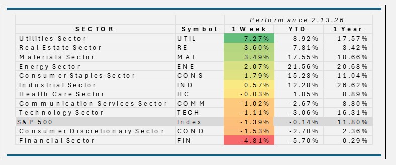 - The S&P 500 declined about 1.4% for the week ending Feb. 13, 2026, as investors shifted away from high-growth technology and AI-linked stocks that had previously driven much of the market’s gains. Risk appetite pulled back, leading many investors to rotate from growth into more defensive or value-oriented sectors. Mixed corporate earnings also contributed to volatility, with notable stock-specific moves throughout the week.