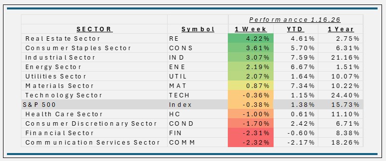 - For the week ending January 16, 2026, the S&P 500 slipped about 0.4% as investors balanced encouraging corporate earnings with ongoing economic and policy concerns. Strong results from technology and semiconductor companies supported the market at times, but mixed earnings from financials and uncertainty around Federal Reserve policy kept sentiment cautious. Investors also rotated toward more defensive areas of the market, reflecting some nervousness about the outlook. Overall, the modest pullback highlights a market still supported by solid fundamentals, but sensitive to interest rates, policy signals, and earnings surprises—conditions that may continue to drive short-term volatility.